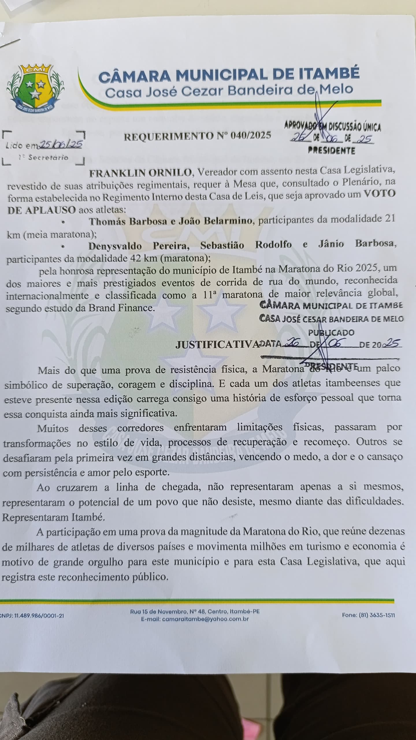 Itambé Aplaude Seus Atletas: Câmara Municipal Reconhece Feitos na Maratona do Rio 2025
