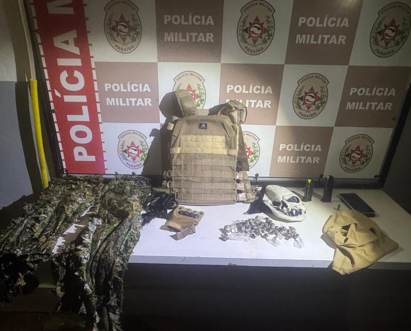 Durante as diligências, os agentes conseguiram neutralizar o grupo e realizar a apreensão de um vasto material ilícito utilizado para a proteção e execução de atividades criminosas. Entre os itens recolhidos estão um colete balístico, carregadores de pistola, roupas camufladas e balaclavas, equipamentos que indicavam o planejamento de ações violentas ou resistência armada contra as forças de segurança. Além do aparato bélico e tático, também foi encontrada uma quantidade de drogas, reforçando a atuação do grupo no tráfico de entorpecentes.