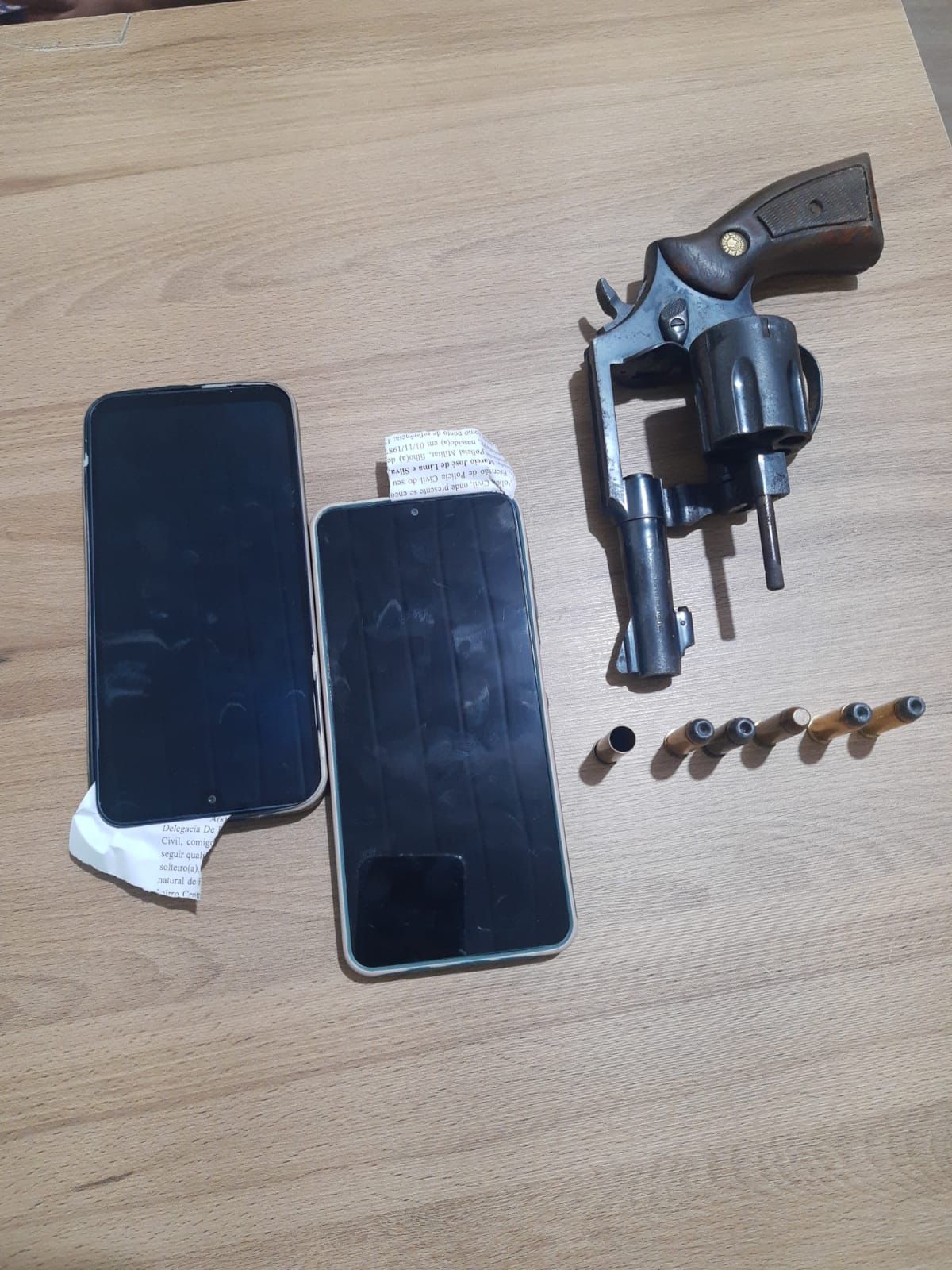 Os indivíduos ainda tentaram fugir pelo matagal, porém doiram alcançados, com os mesmo foram apreendidos dois aparelhos celulares, uma arma de fogo “revólver” seis munições, sendo uma deflagrada.