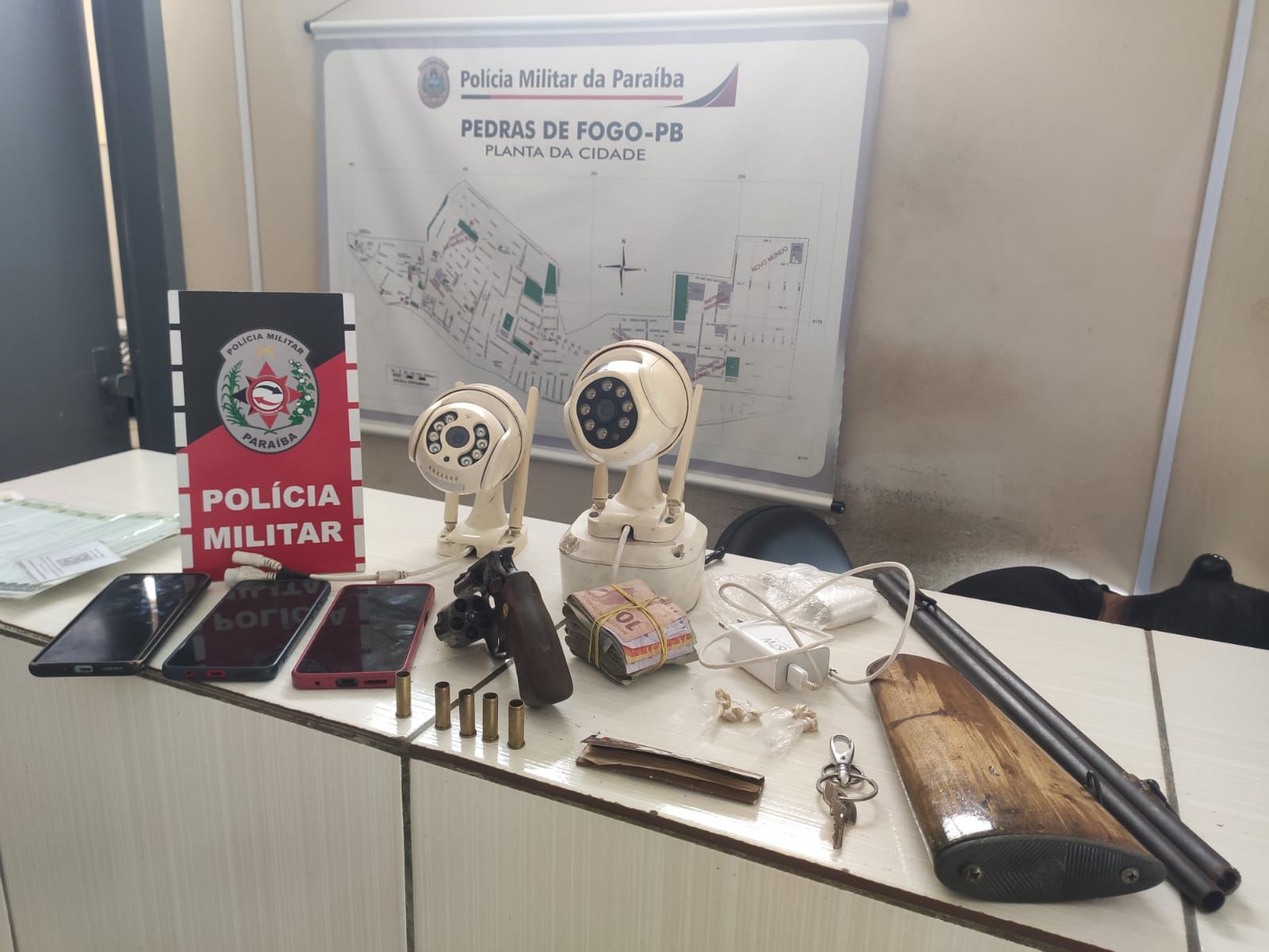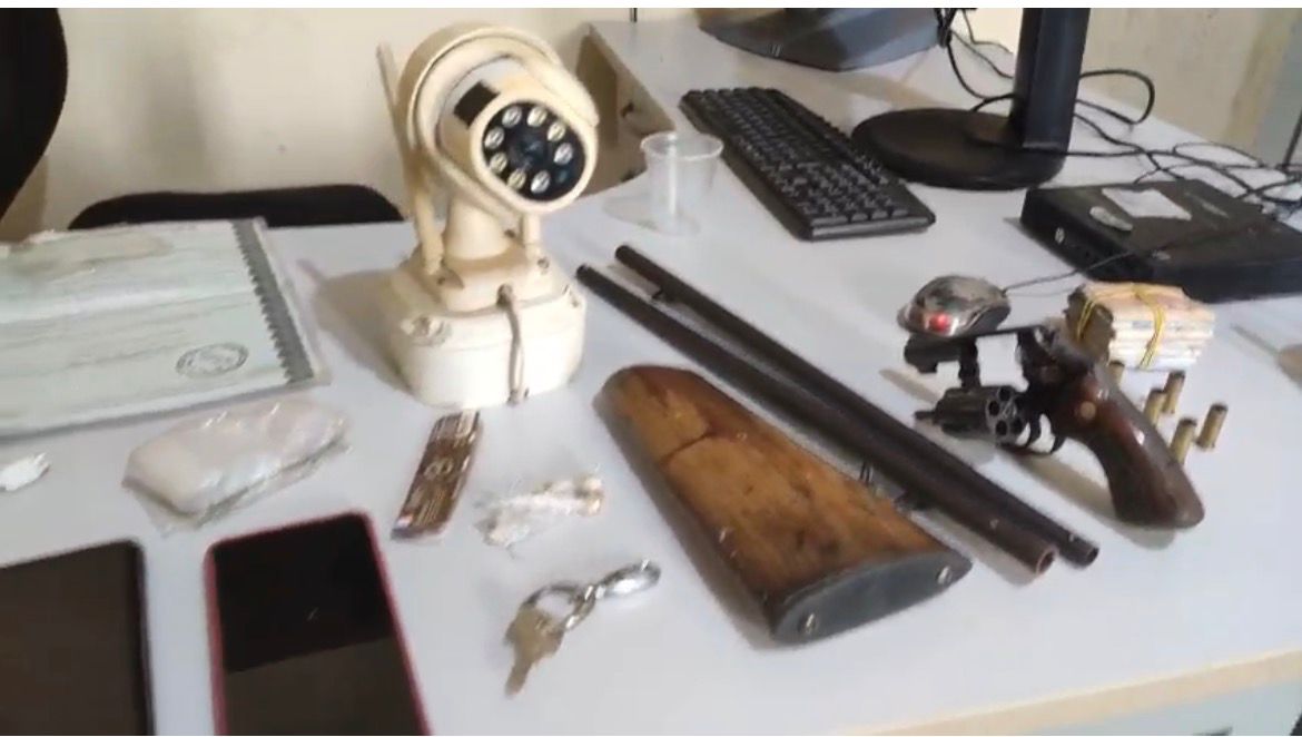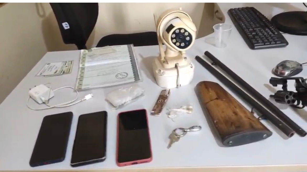 Com os criminosos foram apreendidos câmeras de segurança, celulares e carregadores, pedras de crack, uma quantidade de dinheiro em espécie, um revólver com munições deflagradas e uma espingarda.