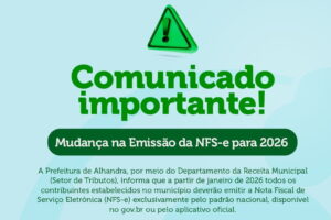 A Prefeitura de Alhandra, por meio do Departamento da Receita Municipal, comunicou uma mudança importante para todos os contribuintes estabelecidos no município: a partir de janeiro de 2026, a emissão da Nota Fiscal de Serviço Eletrônica (NFS-e) será realizada exclusivamente pelo padrão nacional, disponibilizado no portal gov.br e no aplicativo oficial.