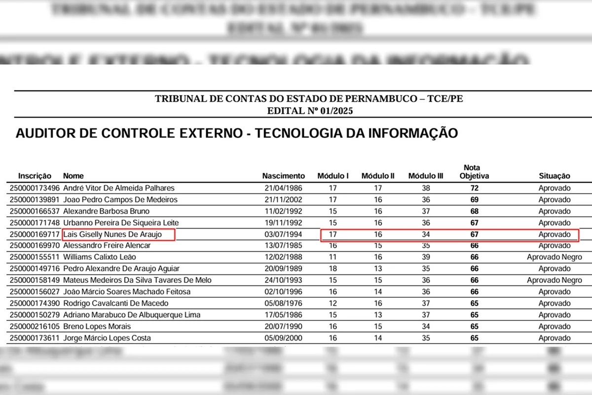 O Tribunal de Contas do Estado de Pernambuco (TCE-PE) anunciou, nesta terça-feira (7/10), a suspensão de todos os atos relacionados ao seu mais recente concurso público. A medida foi adotada após a divulgação de que Laís Giselly Nunes de Araújo, de 31 anos, investigada pela Polícia Federal (PF) por fraudes em concursos públicos, consta na lista de aprovados para o cargo de analista de controle externo.
